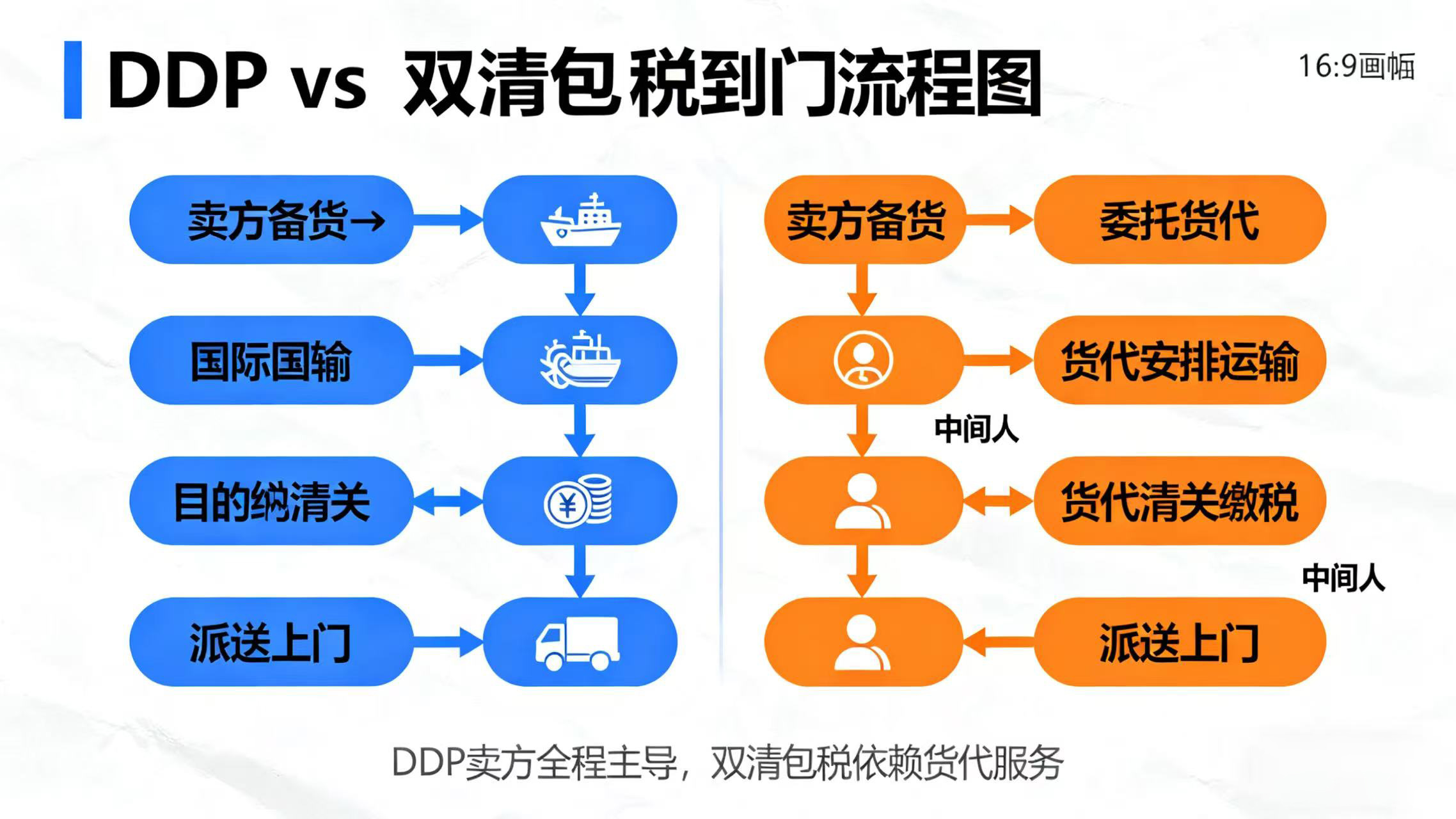 分段服务整合:由货代公司整合资源,负责国内出口报关+目的国清关+税费代缴+末端派送(即“双清包税到门”),实质是“机场到门”的延伸服务。
